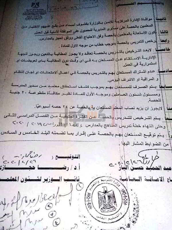 أكد الدكتور رضا حجازي، نائب وزير التربية والتعليم والتعليم الفني، على موافقة وزير المالية على الاستعانة بغير العاملين في وزارة التربية والتعليم من حملة المؤهلات العليا للقيام بالعمل بنظام الحصة.