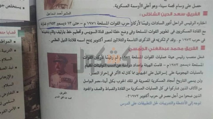 وأشار مجدي إلى أن الفقرة جائت كالتالي: "الفريق سعد الدين الشاذلي، اختاره الرئيس الراحل أنور السادات رئيسا لأركان حرب القوات المسلحة عام 1971م وحتى عام 1953م" وهنا يظهر لنا الخطأ الواضح في التاريخ حيث أن التاريخ الصحيح هو توليه منذ عام 1971م وحتى عام 1973م".