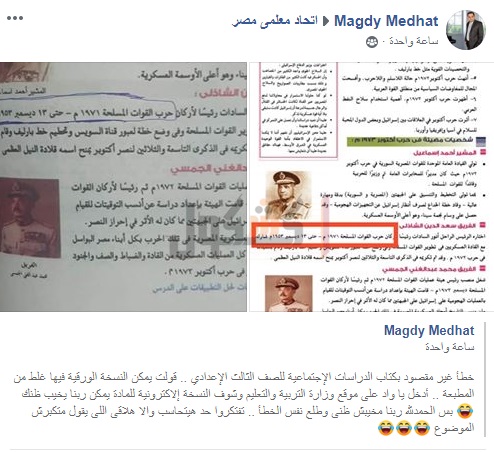 نشر مجدي مدحت مؤسس جروب "نافذة على التعليم" على موقع التواصل الاجتماعي "فيسبوك" صورة للصفحة رقم 66 من كتاب الدراسات الاجتماعية للصف الثالث الإعدادي، موضحا أن هناك خطأ في التواريخ في الفقرة التعريفية الخاصة بالفريق سعد الدين الشاذلي.