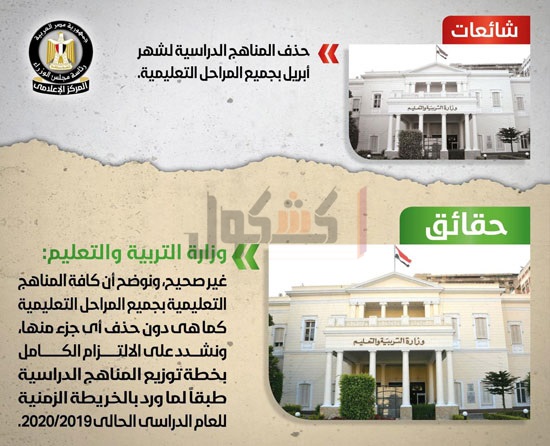 نفى المركز الإعلامي بمجلس الوزراء ما تداولته بعض وسائل الإعلام والمواقع الإلكترونية وصفحات التواصل الاجتماعي من أنباء حول اعتزام وزارة التربية والتعليم حذف المناهج الدراسية لشهر أبريل بجميع المراحل التعليمية وتحويلها للاطلاع فقط.