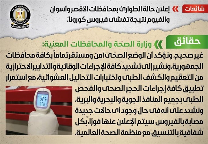 قال المركز الإعلامي لمجلس الوزراء، إنه تواصل مع وزارة الصحة والسكان والمحافظات المعنية، لبحث حقيقة ما تداولته بعض وسائل الإعلام والمواقع الإلكترونية وصفحات التواصل الاجتماعي، من أنباء حول إعلان حالة الطوارئ بمحافظات الأقصر وأسوان والفيوم نتيجة تفشي فيروس كورونا.