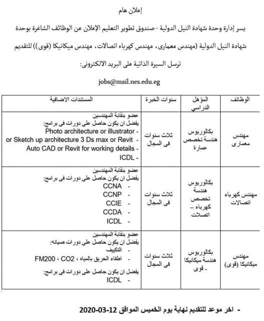 أعلنت إدارة وحدة شهادة النيل الدولية - صندوق تطوير التعليم الإعلان عن وظائف شاغرة، وهي (مهندس معمارى، مهندس كهرباء اتصالات، مهندس ميكانيكا (قوى)).