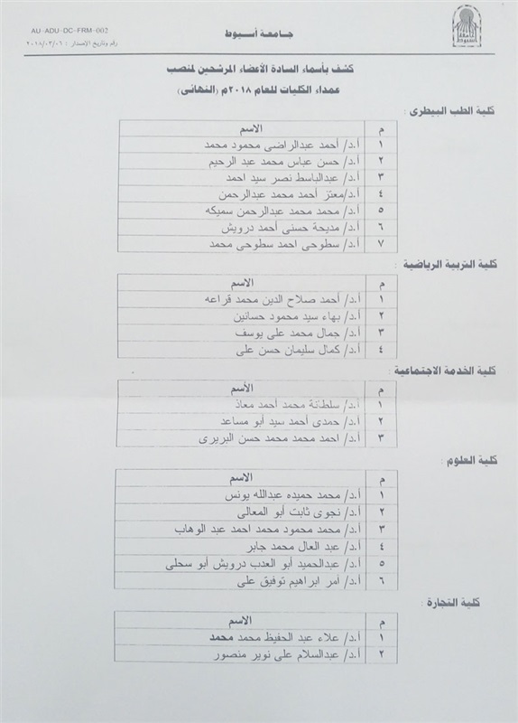 أعلنت جامعة أسيوط، عن الكشف النهائى للسادة أعضاء هيئة التدريس المتقدمين لوظيفة عميد لعدد من كليات الجامعة هم "التربية الرياضية، التربية، الطب البيطرى، الزراعة، الحاسبات والمعلومات، التمريض، التجارة، الخدمة الاجتماعية، الآداب، العلوم".