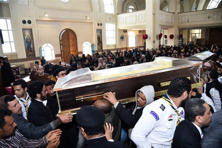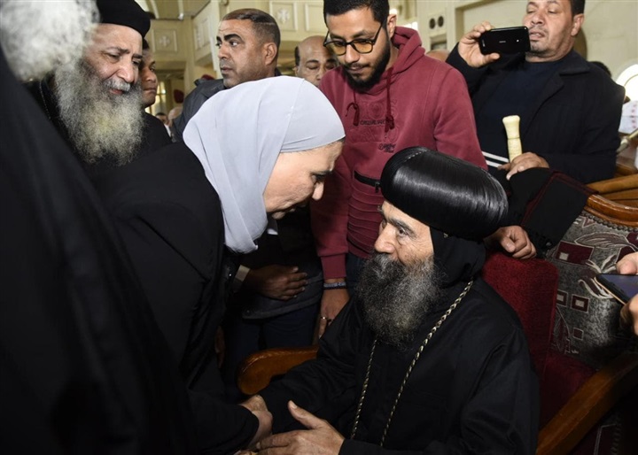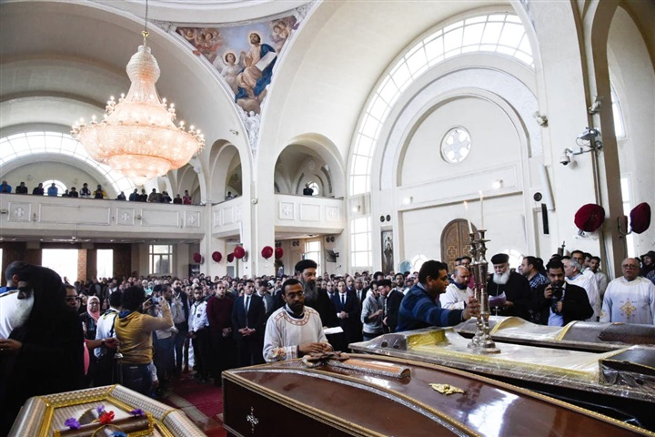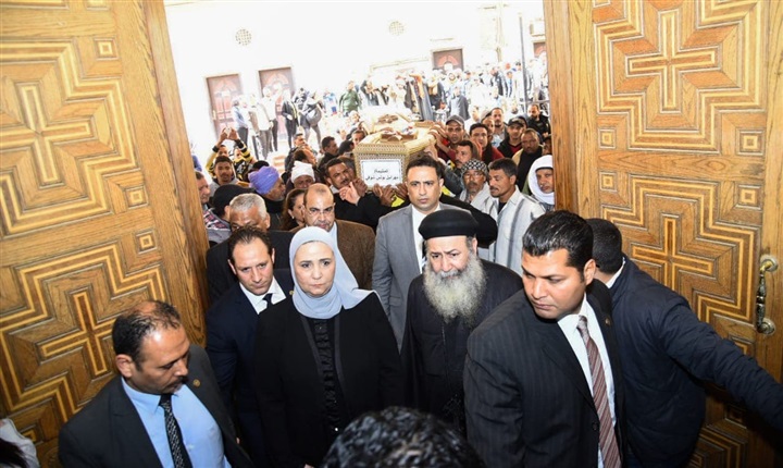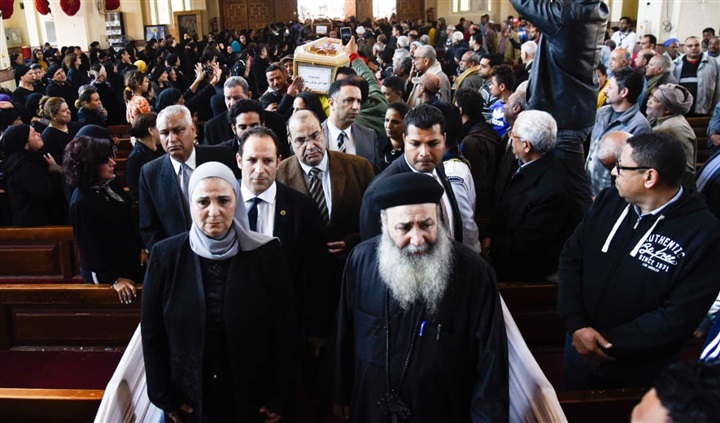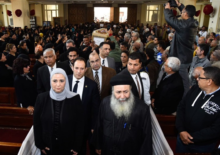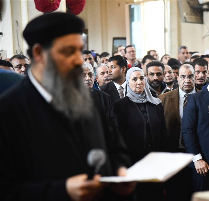 حضرت وزيرة التضامن الاجتماعي نفين القباج، قداس الجنازة لضحايا منطقة عزبة الزرايب والذي أقيم في كنيسة مارمرقس بمدينة ١٥ مايو، نيابة عن الدكتور مصطفي مدبولي رئيس مجلس الوزراء.
