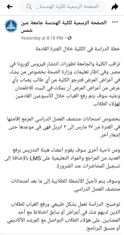 أعلنت كلية الهندسة بجامعة عين شمس، خطة الدراسة بالكلية خلال الفترة القادمة، مؤكدة أنها تتابع تطورات انتشار فيروس كورونا في مصر، حيث أكدت الكلية فى بيان لها عبر صفحتها الرسمية بموقع التواصل الاجتماعى "فيسبوك": "إنه فى إطار تعليمات وزارة الصحة بخصوص من يشك في أعراض المرض فترجو الكلية من أي طالب يصاب بأي عرض من أعراض المرض أن يمكث فى المنزل للاطمئنان وعليه سوف يتم رفع الغياب خلال الأسبوعين القادمين لهؤلاء الطلاب.