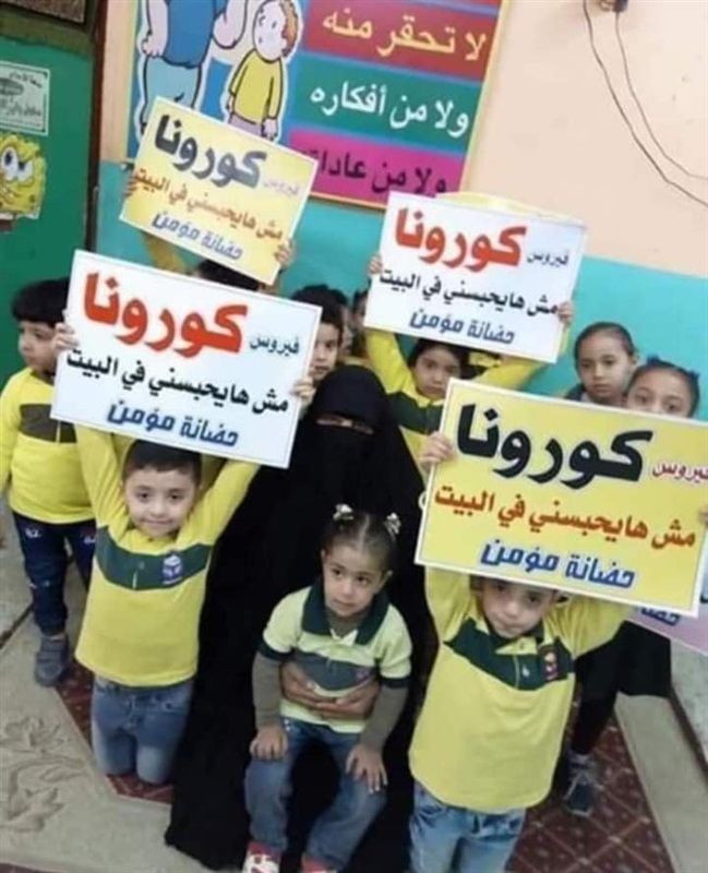 الأطفال يرفعون ملصقات "كورونا مش هتقعدنا في البيت" وتتوسطهم معلمة منتقبة.