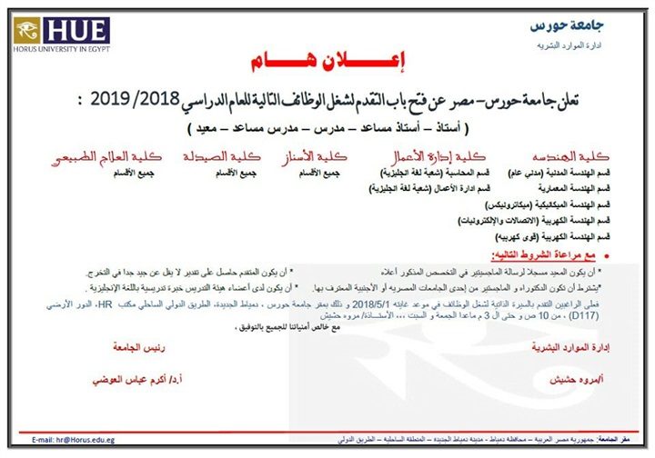 أعلنت جامعة حورس بمصر، عن فتح باب التقدم لشغل عدد من الوظائف للعام الدراسي 2018/2019، وهى "أستاذ، أستاذ مساعد، مدرس، مدرس مساعد، معيد"، وذلك بعدد من الكليات "الهندسة، إدارة الأعمال، طب فم وأسنان، الصيدلة، طب علاج طبيعي".