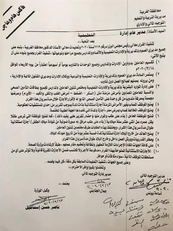 وجهت وزارة التربية والتعليم والتعليم الفني بضرورة التنبيه على جميع مديريات العموم للمديريات والادارات التعليمية والأقسام والمدارس بجميع مراحلها تنفيذ هذه القرارات والتى جاءت كالتالى: