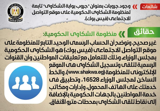 كشف المركز الإعلامي لرئاسة مجلس الوزراء حقيقة وجود جروبات بعنوان" جروب بوابة الشكاوي" تابعة لمنظومة الشكاوي الحكومية علي موقع التواصل الاجتماعي "فيس بوك".