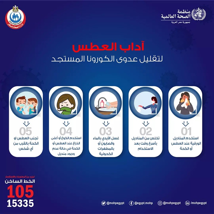 نشر الدكتور خالد مجاهد، المتحدث الرسمي لوزارة الصحة والسكان، انفوجرافًا، عبر صفحته الرسمية على موقع التواصل الاجتماعي "فيس بوك"، يوضح آداب العطس والسعال؛ لتجنب الإصابة بفيروس كورونا المستجد.