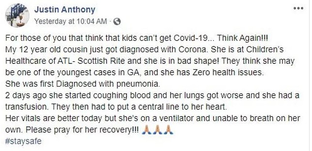 وأوضح "أنتوني" في تصريحه لـ"CNN" أن والدة الطفلة وافقت على قيامها بالكشف عن تفاصيل حالتها لوسائل الإعلام بهدف توصيل رسالة تفيد بأن صغار السن عرضة للإصابة بـ"كورونا" أيضًا، والدليل على ذلك أن طفلة عمرها 12 عامًا تصارع من أجل حياتها، وبذلك فإنه من الضروري التعامل مع الأزمة بجدية واتخاذ الاحتياطات اللازمة لتجنب الإصابة بهذا الفيروس"كورونا".
