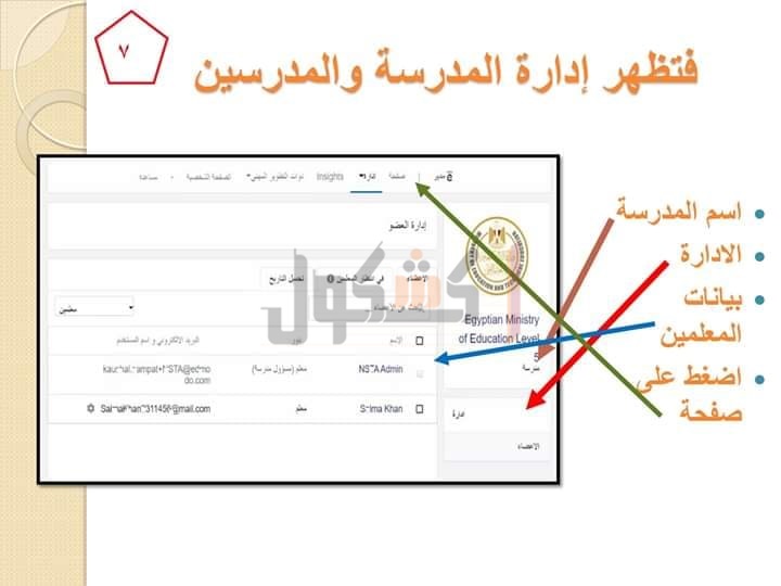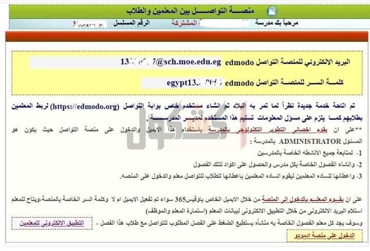 ويقوم أخصائى التطوير التكنولوجى بالمدرسة باستخدام هذا الإيميل والدخول على منصة التواصل، حيث يكون هو المسئول ADMINISTRATOR بالمدرسة: