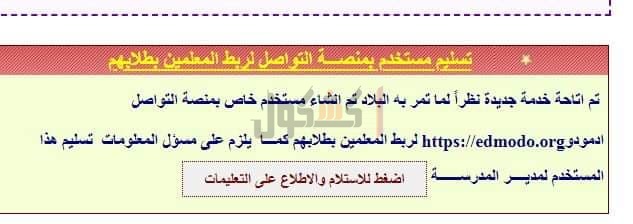 أتاحت وزارة التربية والتعليم والتعليم الفني، خدمة جديدة نظراً لما تمر به البلاد تم انشاء مستخدم خاص بوابة التواصل (https://edmodo.org) لربط المعلمين بطلابهم، كما يلزم على مسؤل المعلومات تسليم هذا المستخدم لمدير المدرسة.