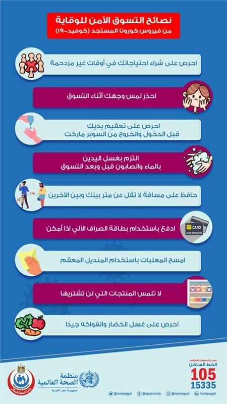 حددت وزرة الصحة والسكان استنادًا على إرشادات منظمة الصحة العالمية، إجراءات والنصائح للتسوق الأمن لمنع الإصابة بفيروس كورونا المستجد كوفيد 19.