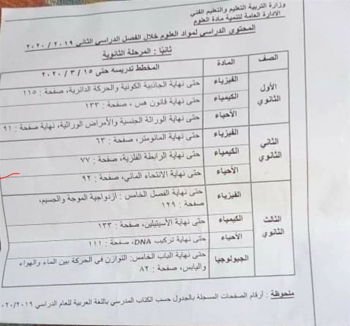 حددت وزارة التربية والتعليم والتعليم الفني المحتوي الدراسي لمواد العلوم بالمرحلة الثانوية خلال الفصل الدراسي الثاني 2019/2020.