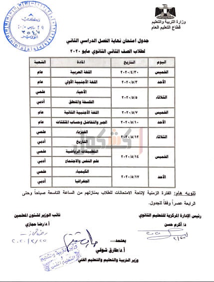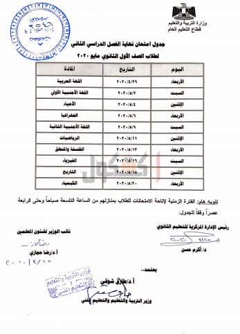 وتبدأ امتحانات الصف الأول الثانوي في الفترة من 29 أبريل حتى 20 مايو 2020، على أن تكون امتحانات الصف الثاني الثانوي في الفترة من 30 إبريل حتى 17 مايو 2020.