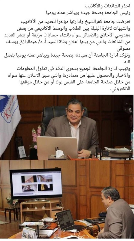 وتعرضت جامعة كفرالشيخ وإدارتها مؤخرا للعديد من الأكاذيب والشبهات لإثارة البلبلة بين الطلاب والوسط الأكاديمي من بعض معدومي الأخلاق والضمير سواء بإنشاء حسابات مزيفة أو نشر العديد من الشائعات، مؤكدة أنه بصحة جيدة ويباشر عمله يوميا بفضل الله.