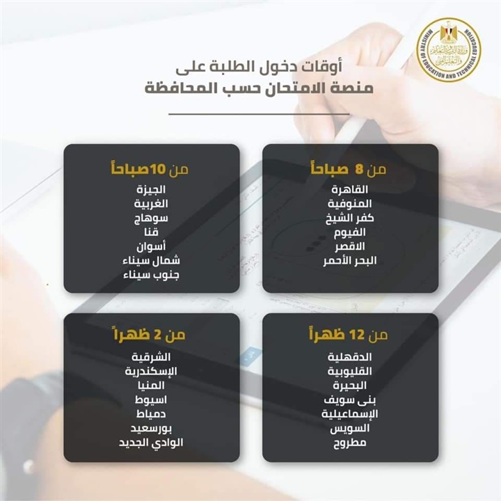 بعد أن أعلنت وزارة التربية والتعليم التعليم الفني، أوقات دخول طلاب الصف الأول الثانوي، على منصة الامتحان حسب كل محافظة، حيث جاء موعد دخول المجموعة الثانية لكلا من محافظات الجيزة، الغربية، سوهاج، قنا، أسوان، شمال سيناء، جنوب سيناء، والذي تم تحديد فترة زمنية يسمح خلالها للطلاب الدخول على الامتحان وهي من الساعة 10 وحتى الساعة 12.