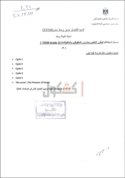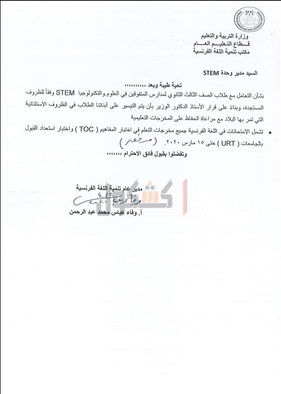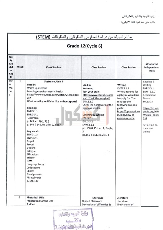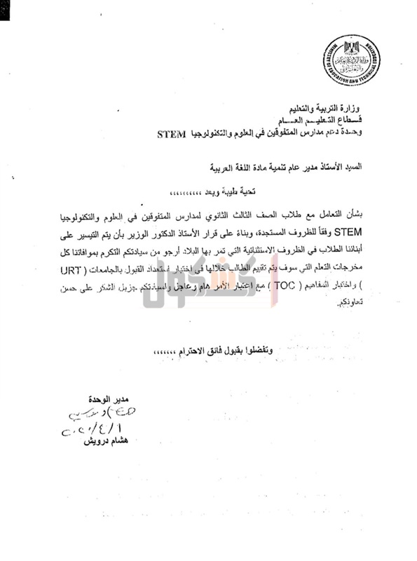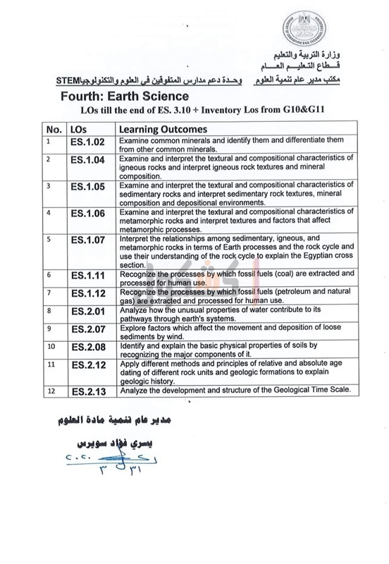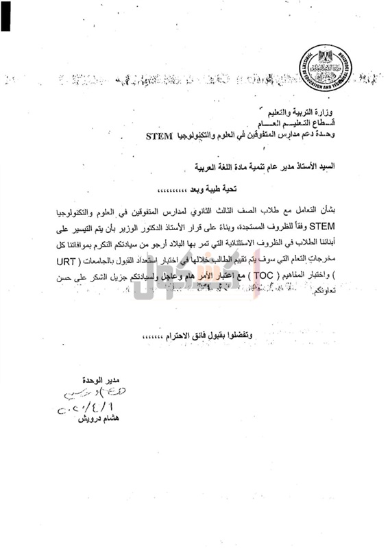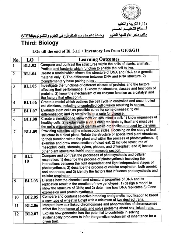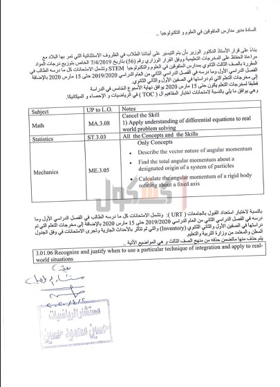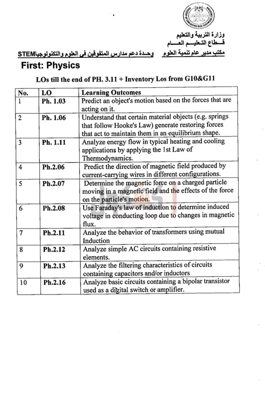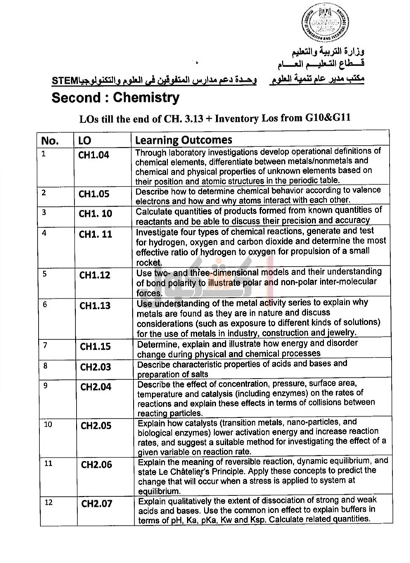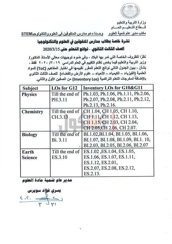 أعلنت وزارة التربية والتعليم والتعليم الفني، اليوم، عن مخرجات التعلم التي يؤدي طلاب الصف الثالث الثانوي لمدارس المتفوقين في العلوم والتكنولوجيا STEM الامتحانات فيها، حتى موعد تعليق الدراسة 15 مارس 2020 بسبب الجائحة المرتبطة بانتشار فيروس كورونا.