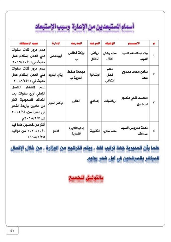 وأعلنت المديرية أيضا أسماء المعلمين المستبعدين من الإعارة وسبب الإستبعاد ، ومن بين أسباب الإستبعاد عدم مرور 3 سنوات علي استلام العمل، إلي جانب عدم إنقضاء الفاصل الزمنى أربع سنوات بعد التقاعد للسعودية أكثر من عامين وأربعة أشهر في الفترة من 1 سبتمبر 2015 إلي 7 /6/2018.