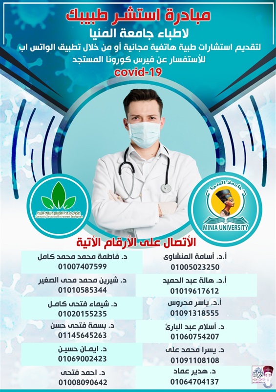 دشن قطاع شئون خدمة المجتمع وتنمية البيئة بجامعة المنيا، مبادرة "استشر طبيبك" لأطباء جامعة المنيا لتقديم الاستشارات الطبية المجانية من خلال الهاتف، أو التواصل عن طريق تطبيق الواتس آب لمواطني محافظة المنيا للرد والاستفسار عن فيروس كورونا المُسْتَجد ومخاطره وأعراضه، تحت رعاية الدكتور مصطفى عبد النبي رئيس الجامعة، والدكتور محمد جلال حسن نائب رئيس الجامعة لشئون خدمة المجتمع وتنمية البيئة.