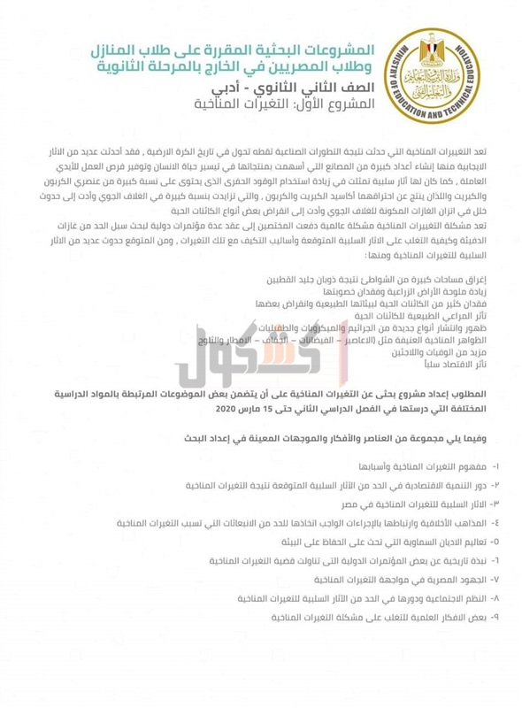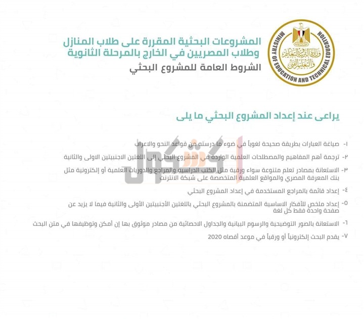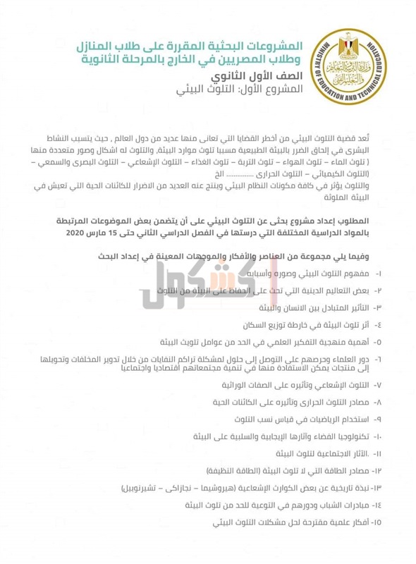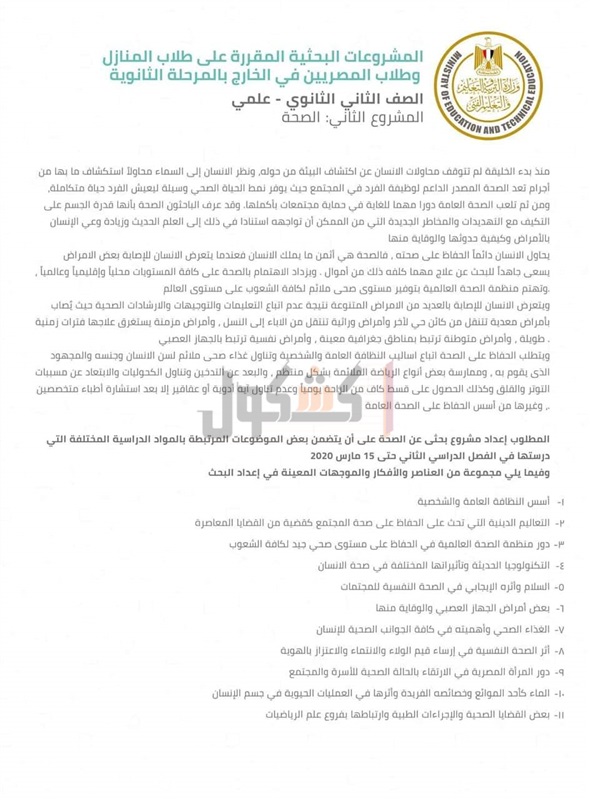 مشروعات الأول والثاني الثانوي لطلاب "المنازل" و"أبنائنا في الخارج"
