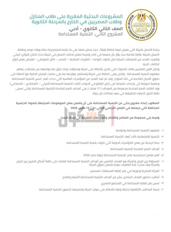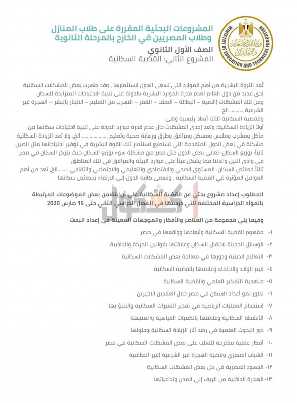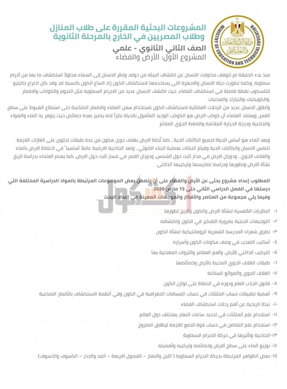أعلنت وزارة التربية والتعليم والتعليم الفني، مشروعات الصف الأول والثاني الثانوي لطلاب "المنازل" و"أبنائنا في الخارج".