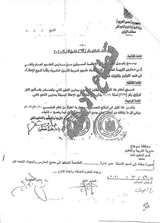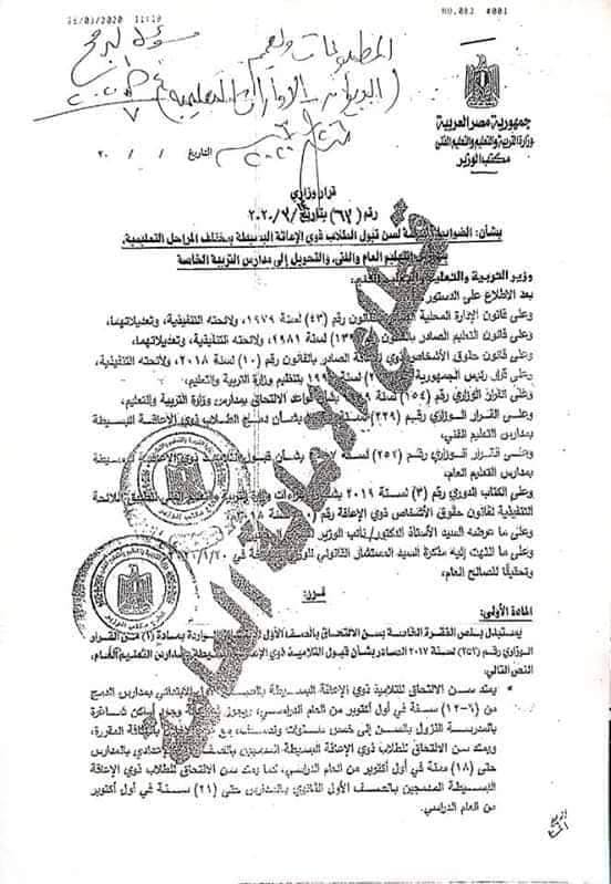 وأكدت الوزارة أن هذا القرار يسرى على طلاب التعليم الفنى المدمجين والصادر بشأنهم القرار الوزارى رقم 229 لسنة 2016 ، بشأن الطلاب ذوى الأعاقة البسيطة بمدارس التعليم الفنى.