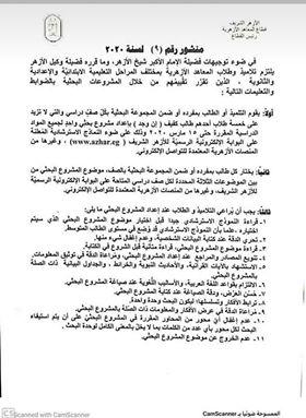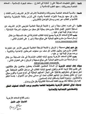 أعلن قطاع المعاهد الأزهرية، تعليمات وضوابط مشاريع البحث لطلاب النقل بالمراحل التعليمية الثلاث " الابتدائية والإعدادية والثانوية".
