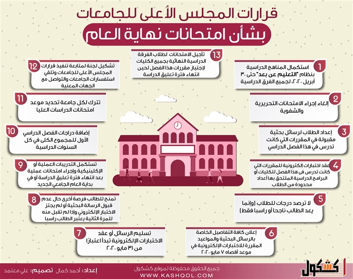 جراف بالانفوجراف.. قرارات المجلس الأعلى للجامعات بشأن امتحانات نهاية العام أحمد كمال السبت 18/أبريل/2020 - 02:56 م 4/18/2020 2:56:00 PM وزير التعليم العالي طباعة facebook twitter whats شارك