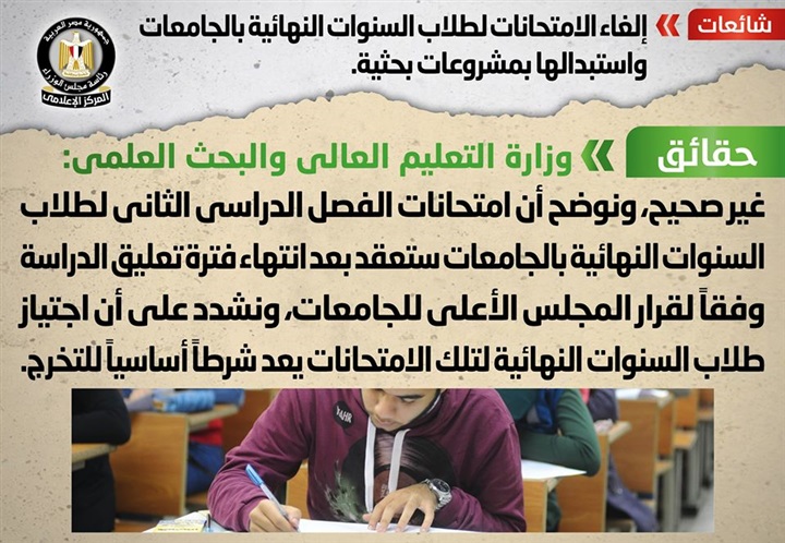 أكد المركز الاعلامي بمجلس الوزراء، أن ما تردد في بعض وسائل الإعلام والمواقع الإلكترونية وصفحات التواصل الاجتماعي، أنباء بشأن إلغاء امتحانات الثانوية العامة لهذا العام وتطبيق نظام القدرات للقبول بالجامعات، غير صحيح.