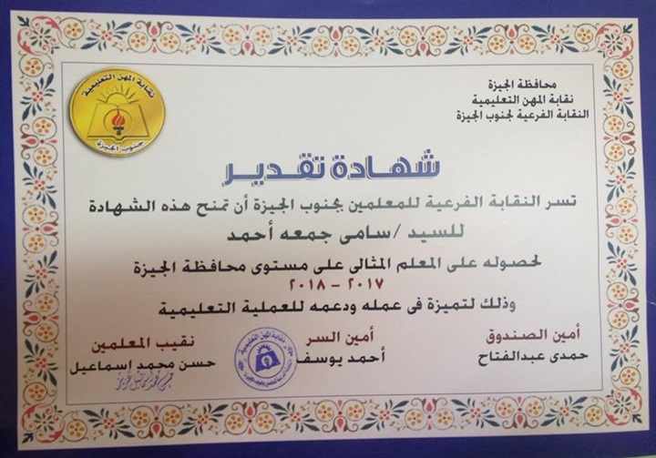 أقيمت مسابقة لنقابة المهن التعليمية بالجيزة على مستوى مديرية التربية والتعليم بالجيزة لاختيار المعلم المثالى وقد فاز بها سامى جمعة منصور على مستاوى المحافظة لما يتمتع به من صفات المعلم المثالى فى كل شئ .