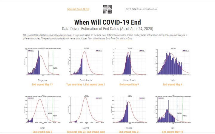 ووضعت جامعة سنغافورة للتكنولوجيا والتصميم (SUTD) بعض الرسومات البيانية التى توضح ذروة وحجم انتشار فيروس كورونا فى البلدان المختلفة، واعتمدت الدراسة على البيانات الرسمية المقدمة من عدد من دول العالم حول الإصابات ودورة حياة الفيروس في تلك البلدان.