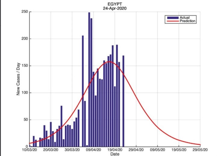 ووفقا للرسم البيانى الخاص بمصر، تتوقع الدراسة أن ينتهى كوفيد 19 بحلول 20 مايو، موضحة أن الذروة ربما تكون وقعت فى الفترة من 9 إلى 19 إبريل.