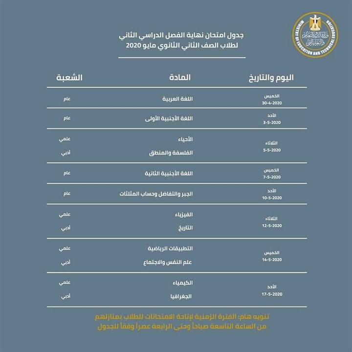 أعلنت وزارة التربية والتعليم والتعليم الفني، جداول امتحانات نهاية الفصل الدراسي الثاني لطلاب الصفين الأول والثاني الثانوي (مايو ٢٠٢٠) والفترات الزمنية المحددة لأداء الاختبار في كل محافظة.
