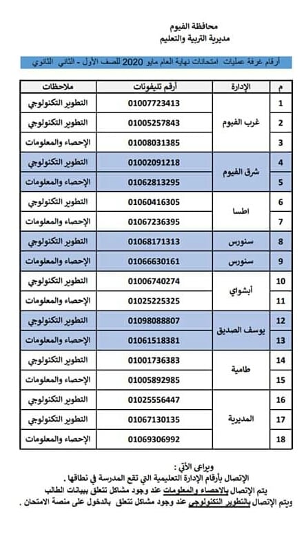تعليم الفيوم تعلن أرقام غرف عمليات امتحانات الأول والثاني الثانوي لتلقي الشكاوى