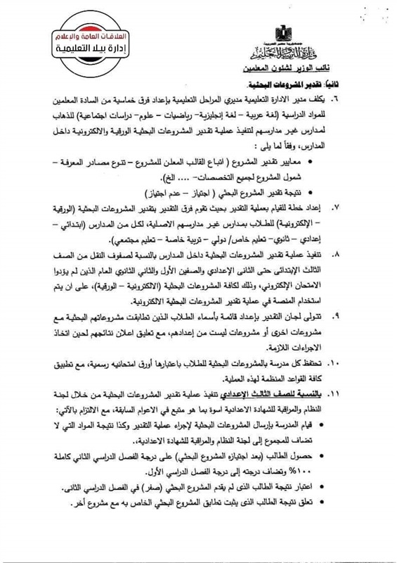 وبالنسبة للصف الثالث الاعدادي ... أكدت وزارة التربية والتعليم على تنفيذ عملية تقدير المشروعات البحثية من خلال لجنة النظام والمراقبة للشهادة الاعدادية اسوة بما هو متبع في الاعوام السابقة مع الالتزام بـ : قيام المدرسة بإرسال المشروعات البحثية لإجراء عملية التقدير وكذا نتيجة المواد التي لا تضاف للمجموع إلى لجنة النظام والمراقبة للشهادة الاعدادية ، وحصول الطالب بعد اجتيازه المشروع البحثي على درجة الفصل الدراسي الثاني كاملة 100%وتضاف درجته إلى درجة الفصل الدراسي الاول .