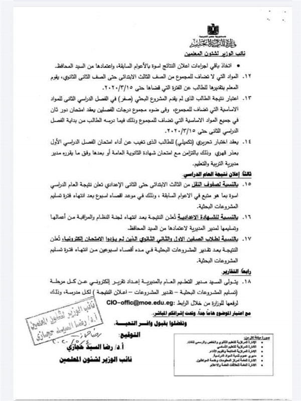 وتعتبر نتيجة الطالب الذي لم يقدم المشروع البحثي صفر في الفصل الدراسي الثاني ، وتعلق نتيجة الطالب الذي يثبت تطابق المشروع البحثي الخاص به مع مشروع آخر ، واتخاذ باقي اجراءات اعلان النتائج اسوة بالاعوام السابقة ، واعتمادها من المحافظ.