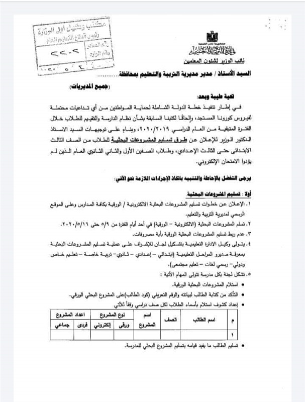 عممت وزارة التربية والتعليم والتعليم الفني، تعليمات رسمية عاجلة علي مديريات التربية والتعليم على مستوى الجمهورية، حول إجراءات استلام المشروعات البحثية الخاصة بطلاب الصفوف من 3 ابتدائي حتى 3 إعدادي هذا العام.