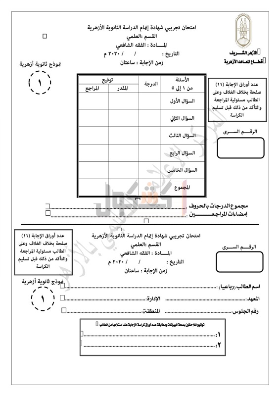 بوكليت الثانوية الأزهرية 2020 مادة الفقه الشافعي للقسم العلمي