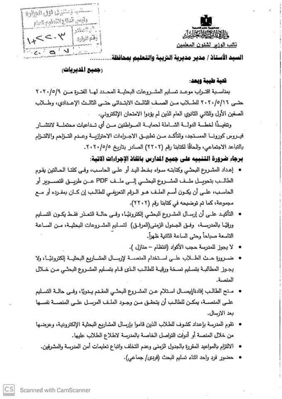 التأكيد علي إرسال المشروع البحث إلكترونيا وبحالة التعذر يتم تسليمه ورقيا للمدرسة وفق الجدول المقترح من الوزارة من الساعة التاسعة صباحا و حتي الثانية ظهرًا .
