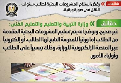 كشفت وزارة التربية والتعليم والتعليم الفني حقيقة ما تردد خلال الايام الماضية علي صفحات ومجموعات السوشيال ميديا حول رفض استلام المشروعات البحثية المطلوبة من طلاب سنوات النقل في صورة ورقية.
