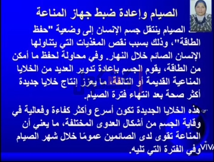 وأضافت أن نصيحة اليوم عن أهمية الصيام ودوره في رفع المناعة تقدمها الدكتورة جيهان مصطفى رئيس قسم إدارة التمريض والقائم بعمل عميد الكلية السابق.