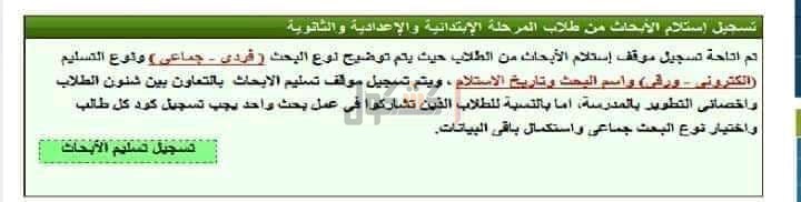 أتاحت وزارة التربية والتعليم والتعليم الفني، من خلال صفحة بيانات التلميذ، عبر موقعها الالكتروني الرسمي، تسجيل موقف إستلام الأبحاث من الطلاب بحيث يتم توضيح نوع البحث ( فردى - جماعى )، ونوع التسليم ( إلكترونى - ورقى)، وإسم البحث وتاريخ الإستلام، ويتم تسجيل موقف تسليم الأبحاث بالتعاون بين مختص شئون الطلاب وأخصائى التطوير بالمدرسة.