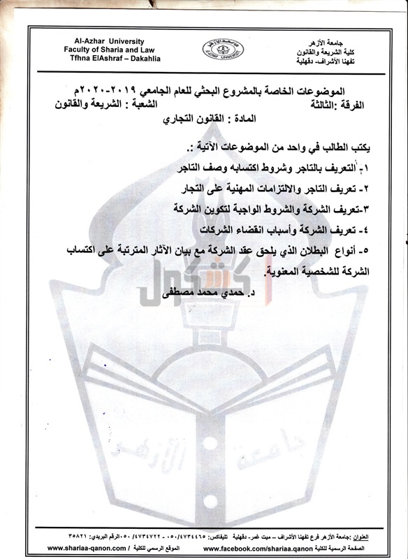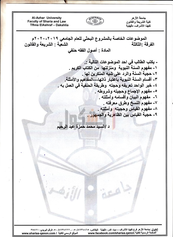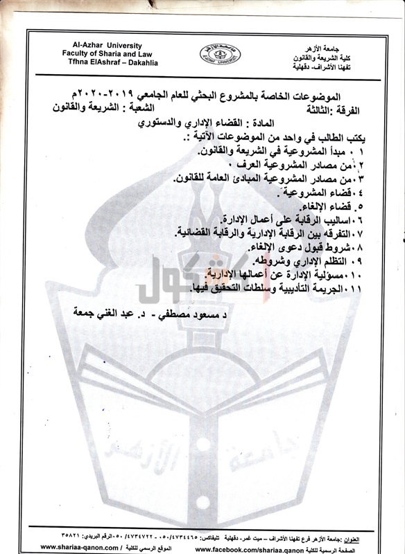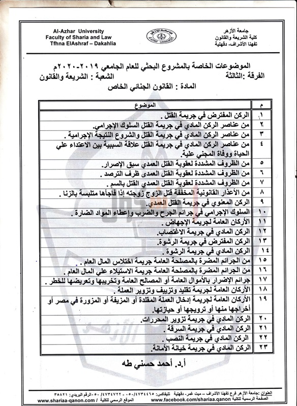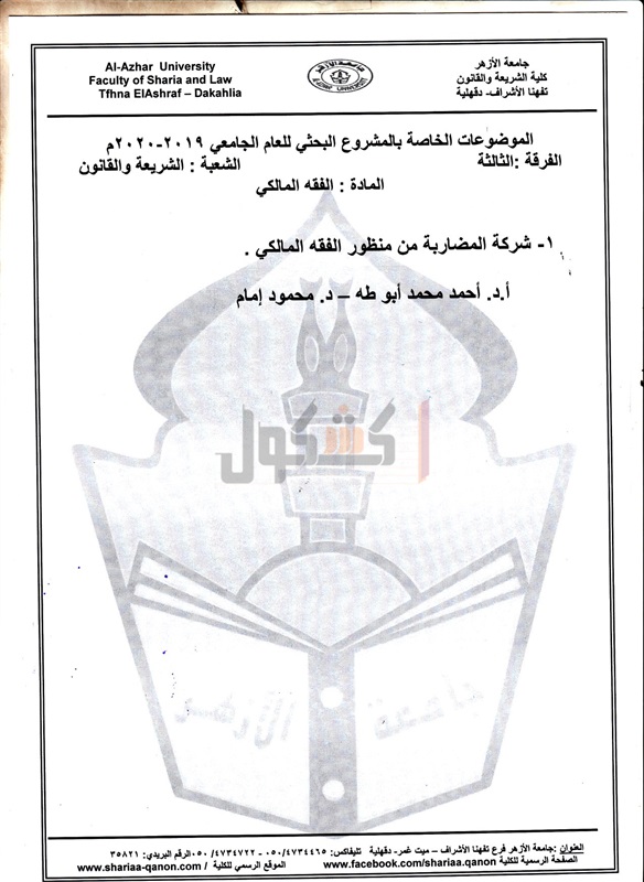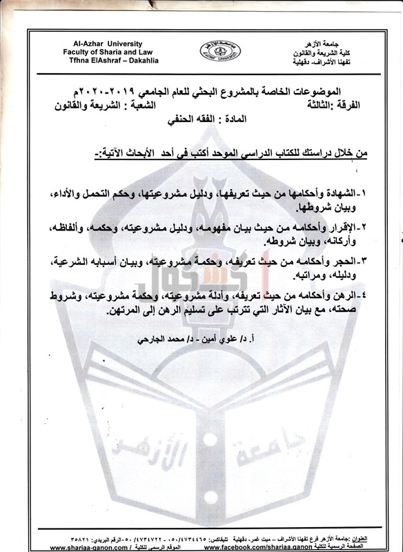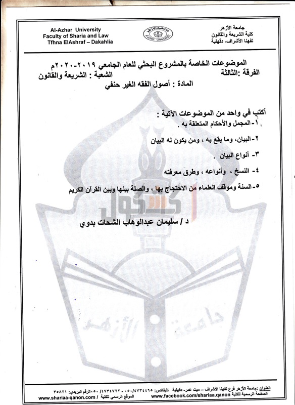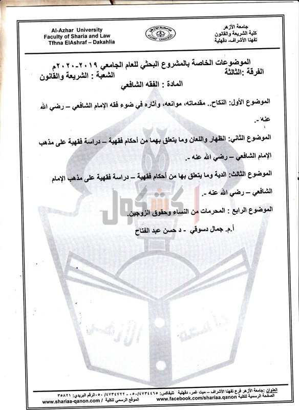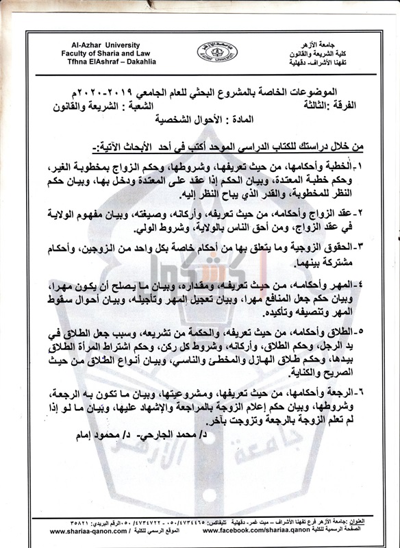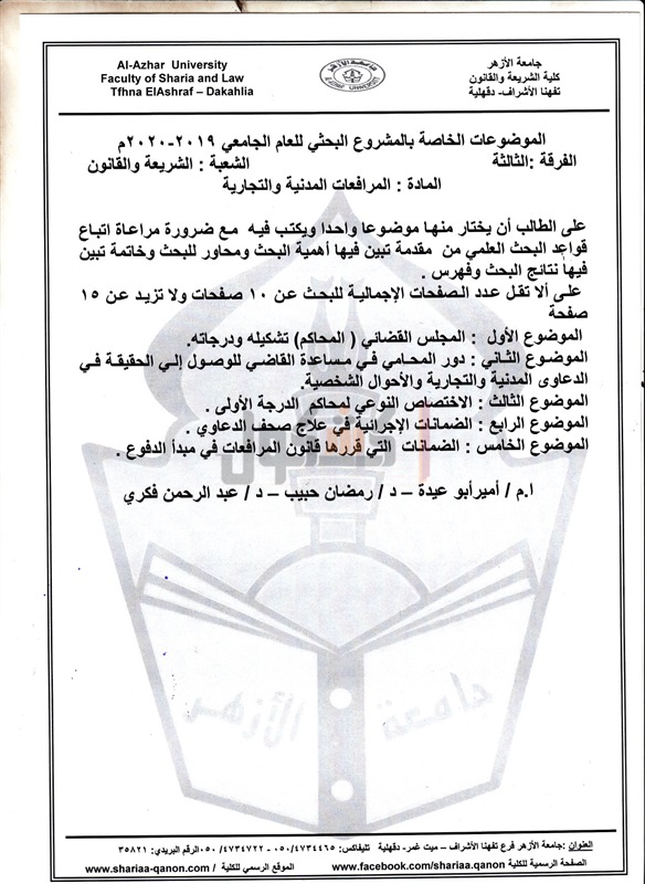 الأبحاث المطلوبة من طلاب الفرقة الثالثة "شريعة وقانون" تفهنا الأشراف