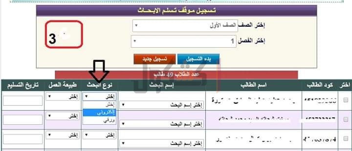 من الطلاب، حيث يتم توضيح نوع البحث ( فردى - جماعى)، ونوع التسليم (الكترونى - ورقى)