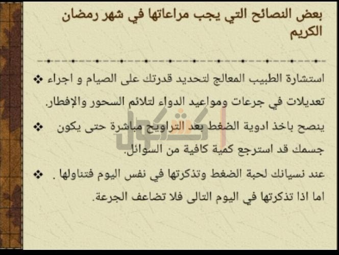 3- لا ينصح بأخذ أدوية الضغط بعد التراويح مباشرة حتى يكون جسمك قد استرجع كمية كافية من السوائل.