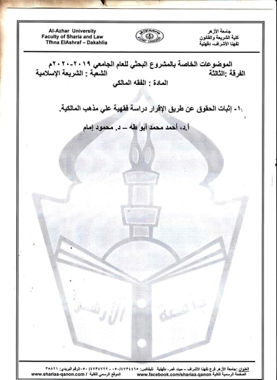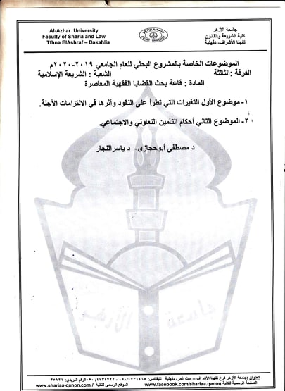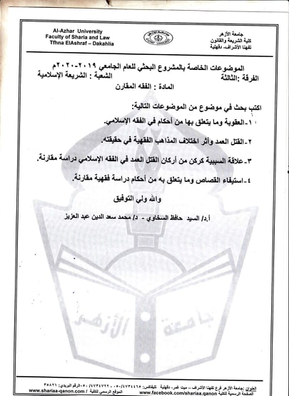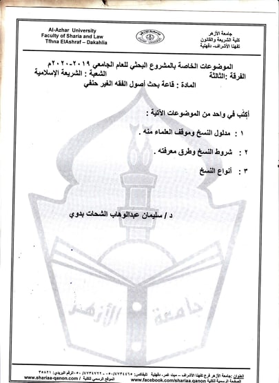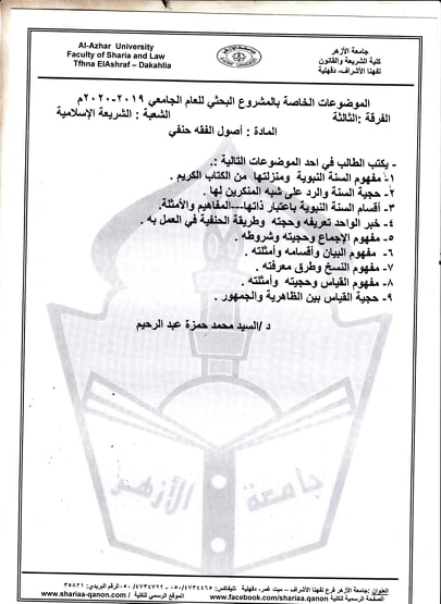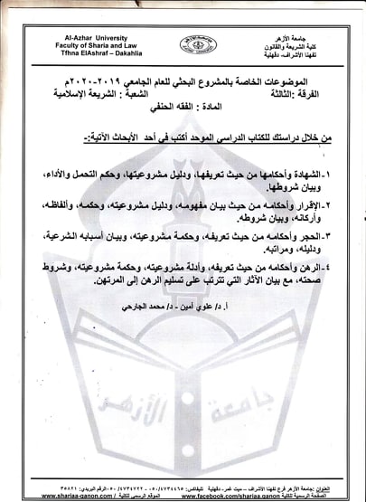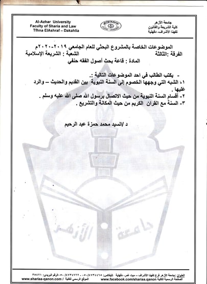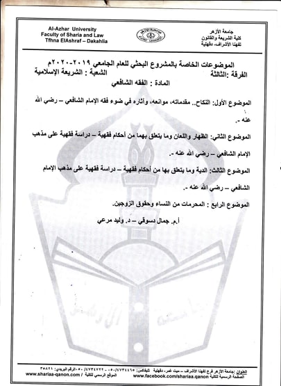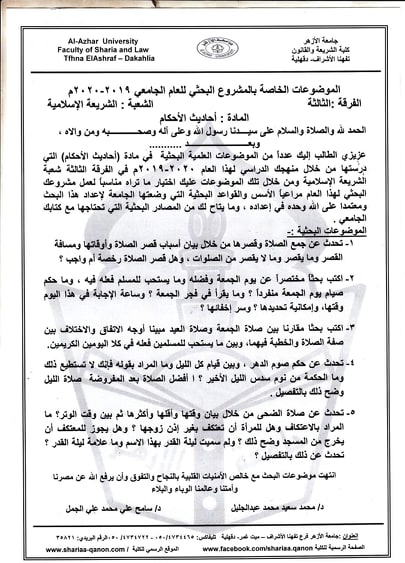 الأبحاث المطلوبة من طلاب الفرقة الثالثة "شريعة إسلامية" تفهنا الأشراف
