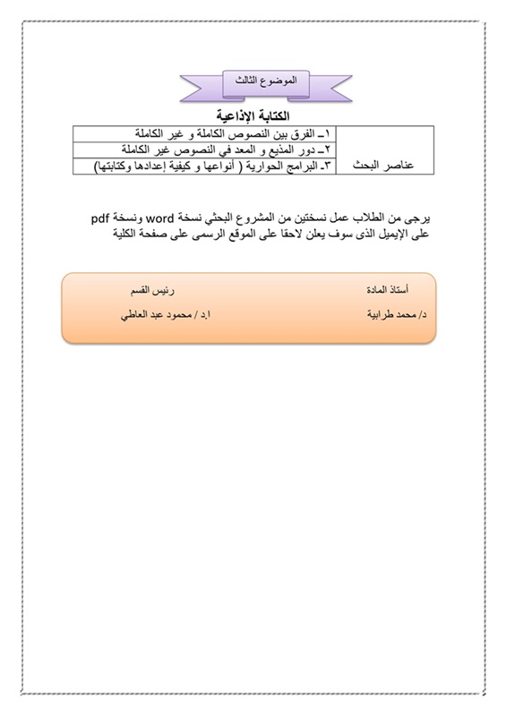 وإليكم موضوع بحث مادة تقديم البرامج الإذاعية والتليفزيونية للفرقة الثالثة قسم الاذاعة والتليفزيون: