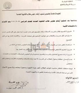 وأكدت المديرية تنها بمناسبة بدء تسليم أرقام جلوس طلاب الثانوية العامة للعام الدراسي 2019 2020 يتم الإلتزام بالتعليمات الاتية: